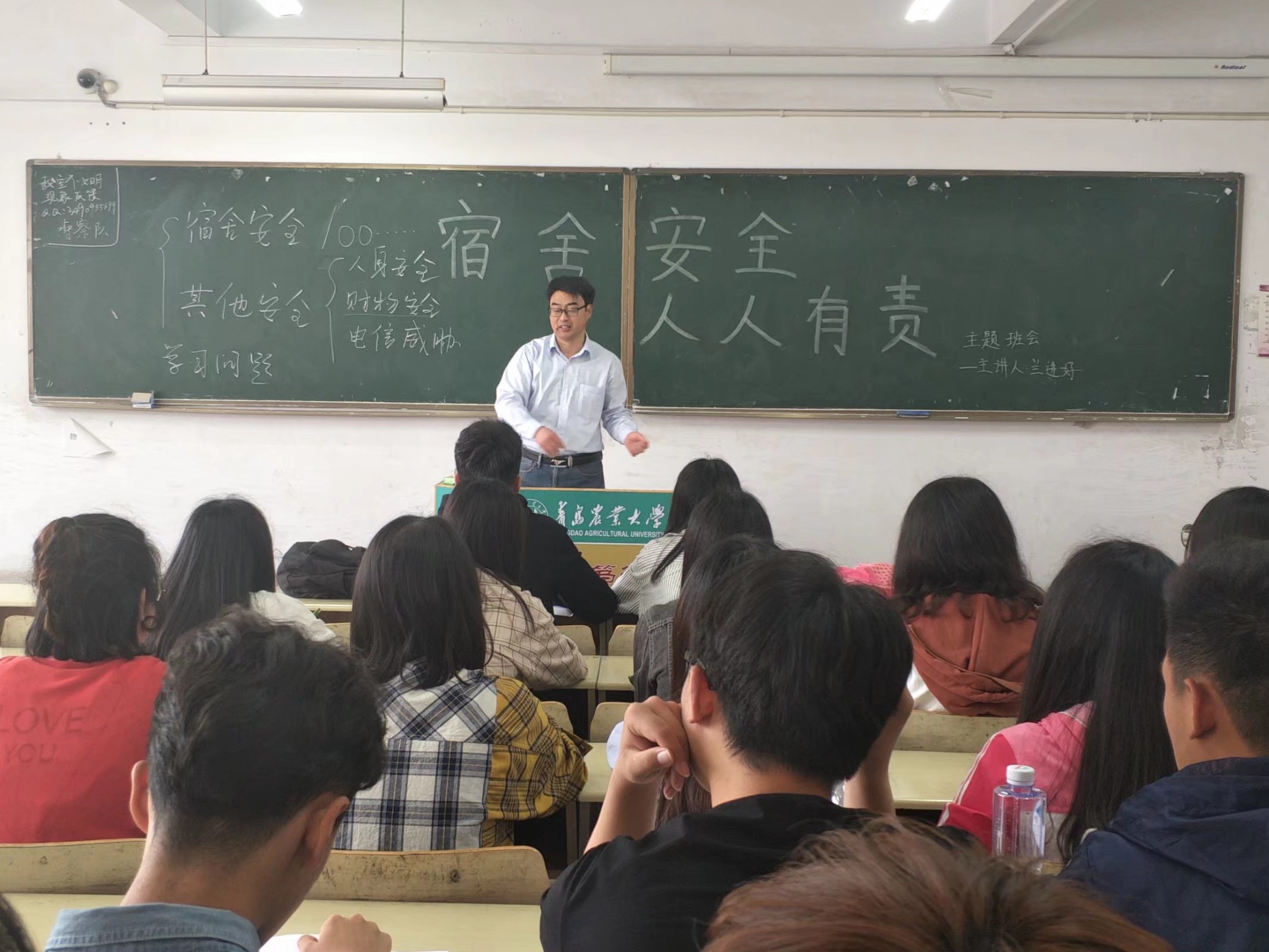 会上,兰进好从宿舍安全和人身安全出发,他讲到,宿舍是同学们的主要生活场所,一定要注意电器的使用,宿舍内禁止使用大功率电器、杜绝无人充电现象、宿舍内禁止使用明火,尤其杜绝宿舍内抽烟问题等,同时同学们也要注意宿舍卫生,努力营造一个干净整洁的生活场所。接着他讲到校外住宿问题,学院一直注重学生安全问题,严禁学生外租住宿,并严查夜不归宿现象,加大惩罚力度。最后,他强调学习是学生的本职,希望大家能够保持优良的学风,严格要求自己。