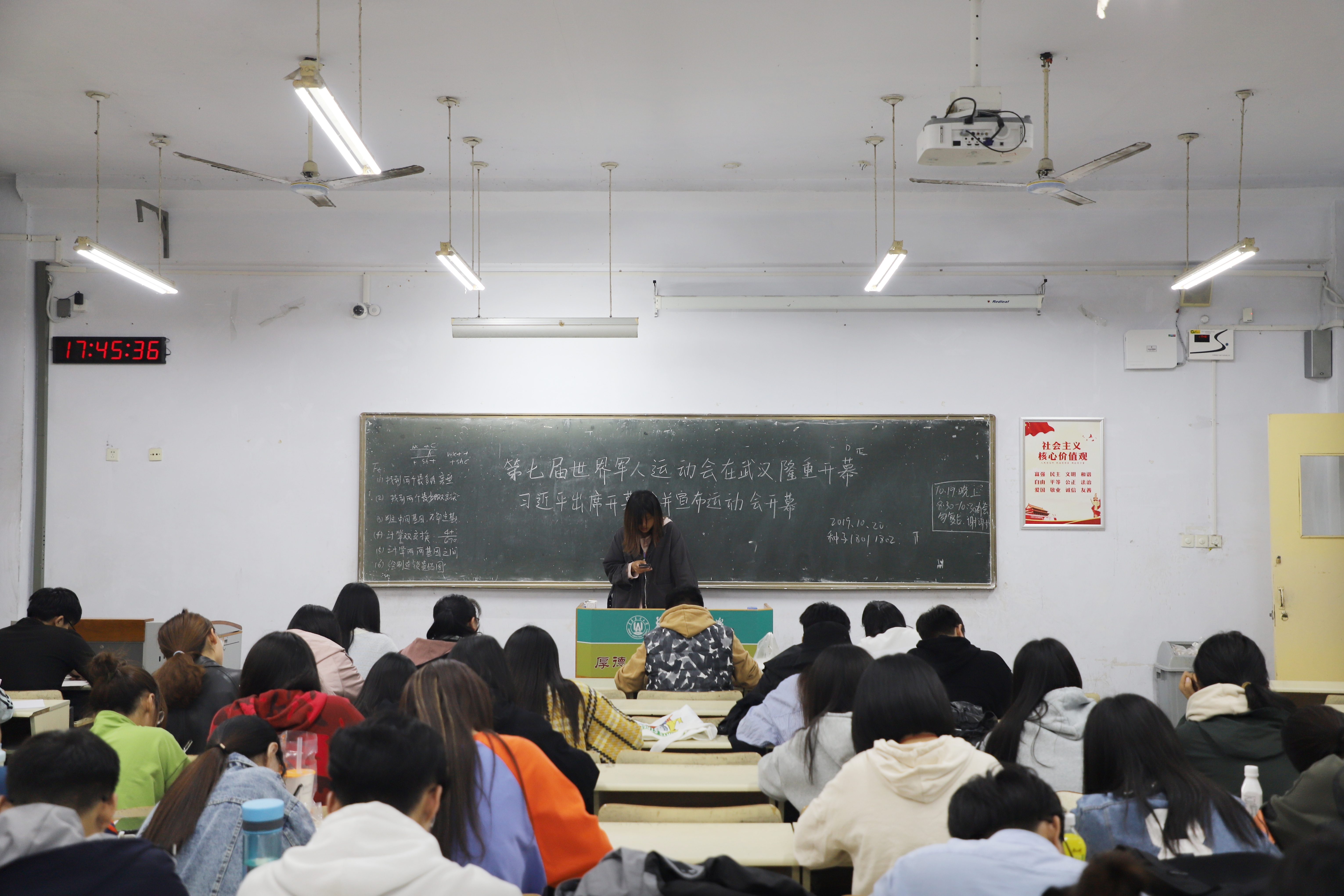 团课伊始,主讲人向同学们介绍了我国第一次承办的综合性国际军事体育赛事第七届世界军人运动会,中共中央总书记、国家主席、中央军委主席习近平在武汉出席第七届世界军人运动会开幕式并宣布运动会开幕,来自109个国家的9300余名军体健儿将在江城武汉同场竞技、增进友谊。随后,主讲人对开幕式的盛大场面进行了详细讲述,当讲到中国代表团高举五星红旗入场时,同学们都感到热血沸腾,一股民族自豪感油然而生,为祖国的日益强大而感到骄傲与自豪。