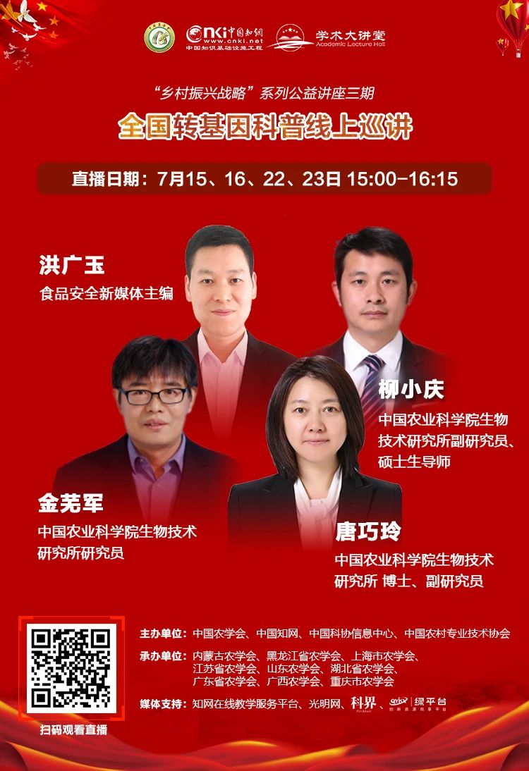 山东农学会参与承办的中国农学会2020年全国转基因科普线上巡讲活动正式启动,巡讲以“转基因,你所不知道的那些事”为主题,针对公众关注的焦点内容,邀请专家进行科普,主动发出权威声音,积极回应社会关切;巡讲将邀请4名知名媒体传播专家在清华同方知网教育频道开展直播,具体时间是7月15、16、22、23日下午15:00,各进行1场。请各单位积极组织广大会员参与收看,引导会员深度了解转基因知识,科学理性看待转基因。