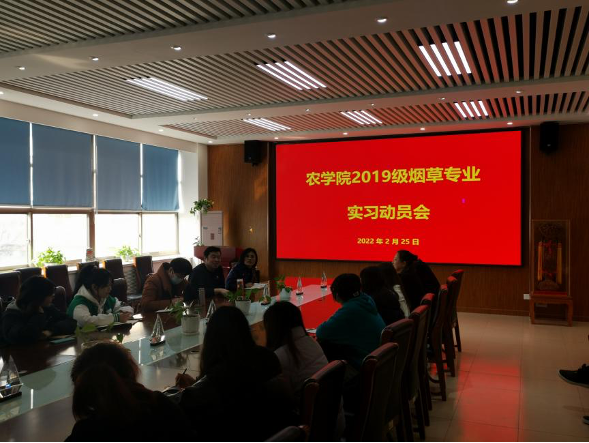 2月25日,beat365在生物楼召开2019级烟草专业毕业实习动员会。学院党总支书记马伟萍、副院长张恩盈、团委书记石勇、烟草专业负责人李玲燕、烟草外聘教研室主任郭新梅、孙青老师和2018级优秀实习生代表张紫琪、赵泮真及烟草2019级全体学生参加了此次动员会,会议由李玲燕主持。