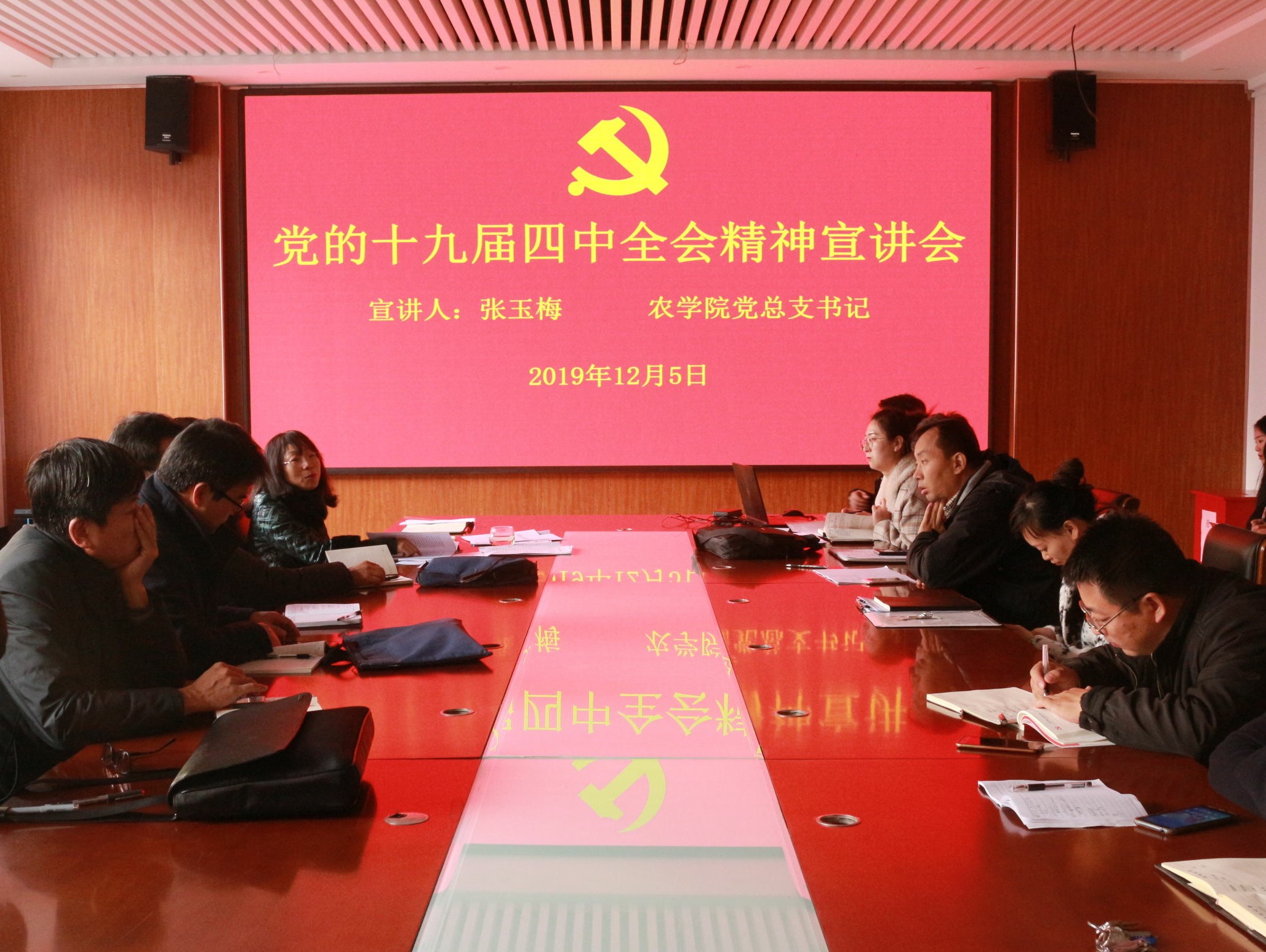 为深入学习贯彻党的十九届四中全会精神,全面深化主题教育成果,12月5日,beat365于生物楼召开党的十九届四中全会精神宣讲会,学校党的十九届四中全会精神宣讲团成员、学院党总支书记张玉梅作党的十九届四中全会精神宣讲报告,学院全体教工和学生党员参加。