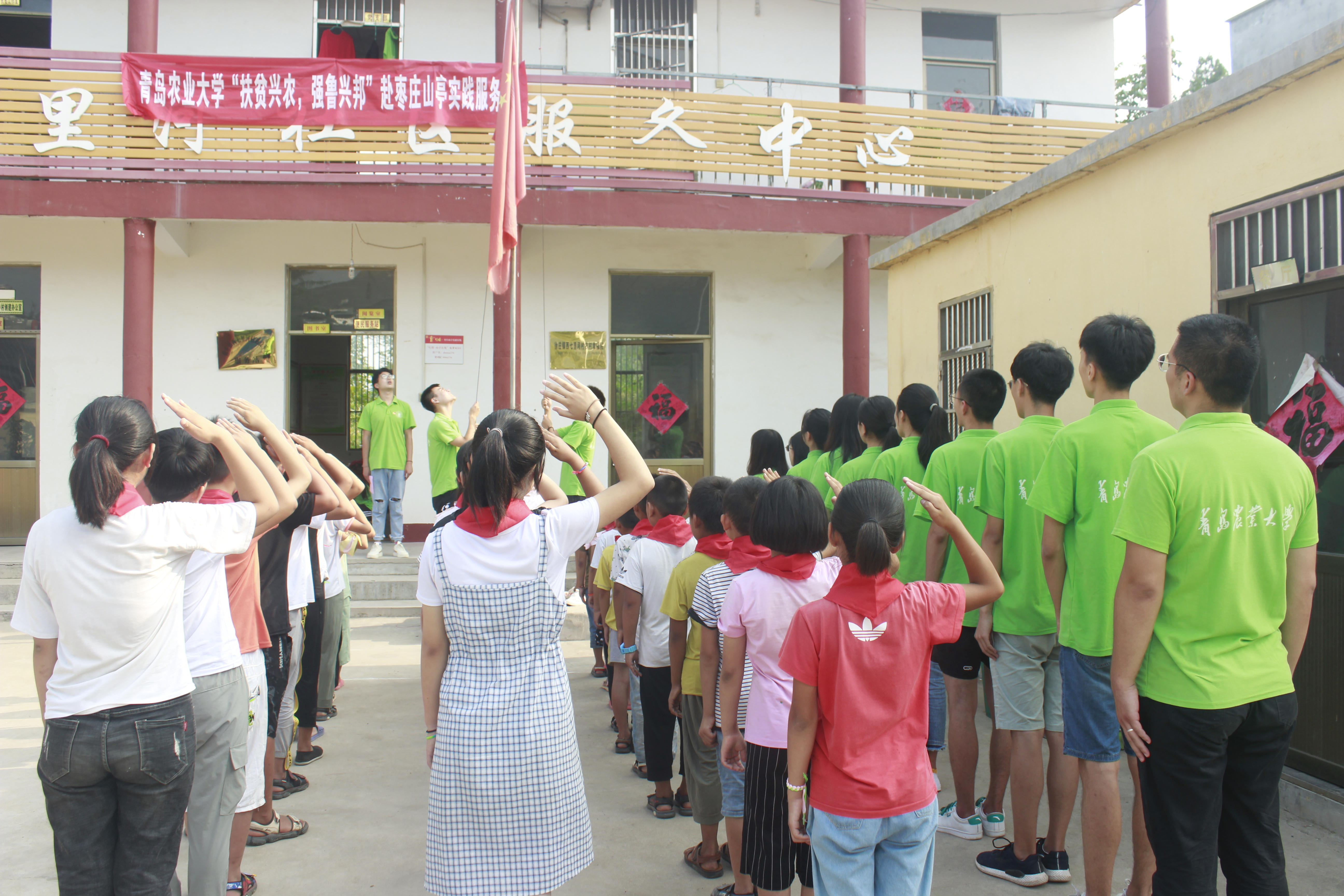 7月20 日,实践团在西七里河村为当地孩子举办了一场升旗仪式。仪式分为老兵为少先队员佩戴红领巾、升国旗唱国歌、队长李栋带领孩子国旗下宣誓、队员侯圣玺国旗下讲话、表彰“六禾”之星五部分进行。