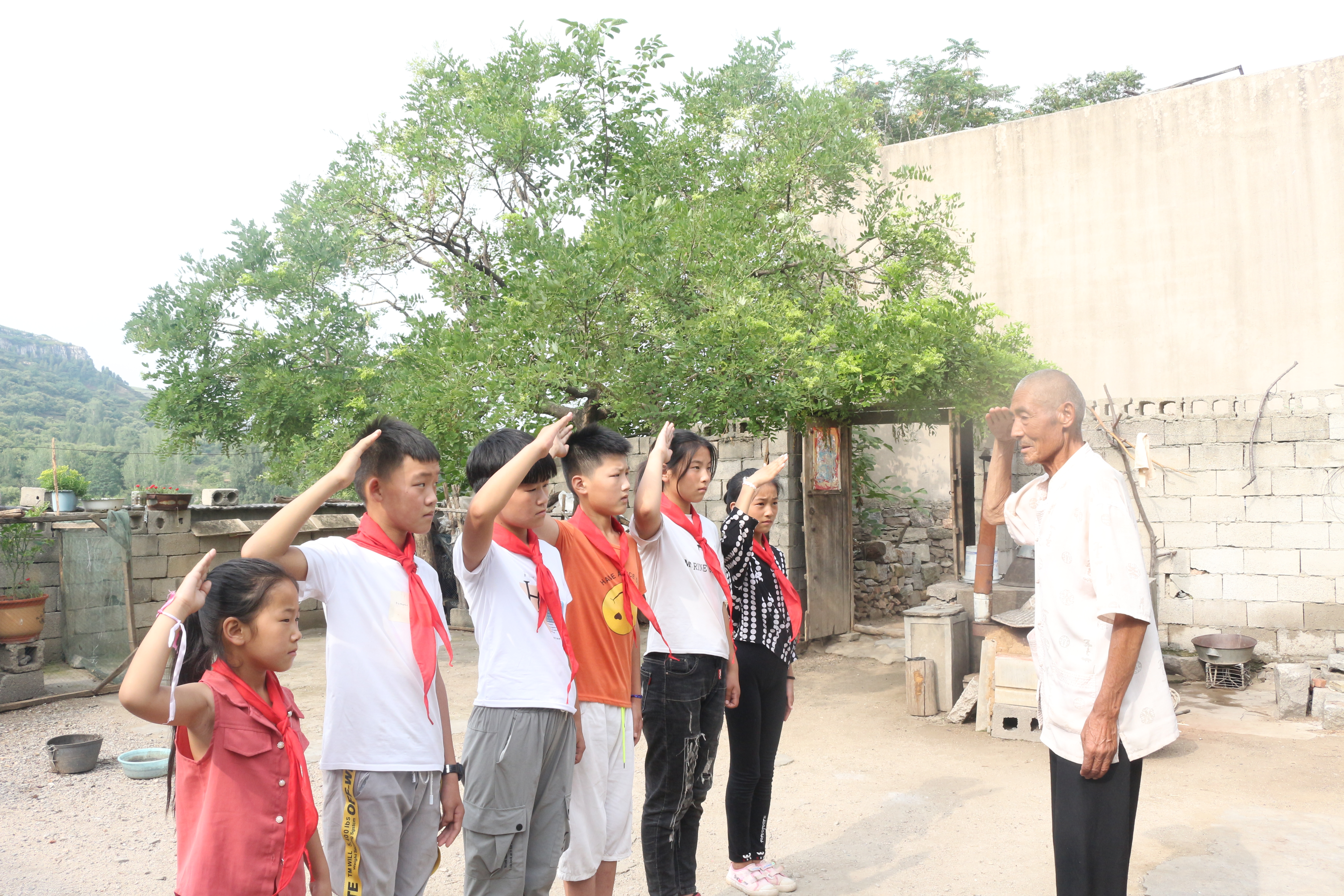 村民张文友是村中德高望重的老人,同时也是一名老兵。由于张爷爷身体不便,李栋带领少先队员代表来到张爷爷家中送上慰问,张爷爷为少先队员带上鲜艳的红领巾,少先队员和张爷爷相互敬礼。张爷爷向少先队员提出两点要求:一、热爱祖国,时刻把国家放在首位;二、努力学习,争做国家的栋梁之才。少先队员表示定不负张爷爷的期望。